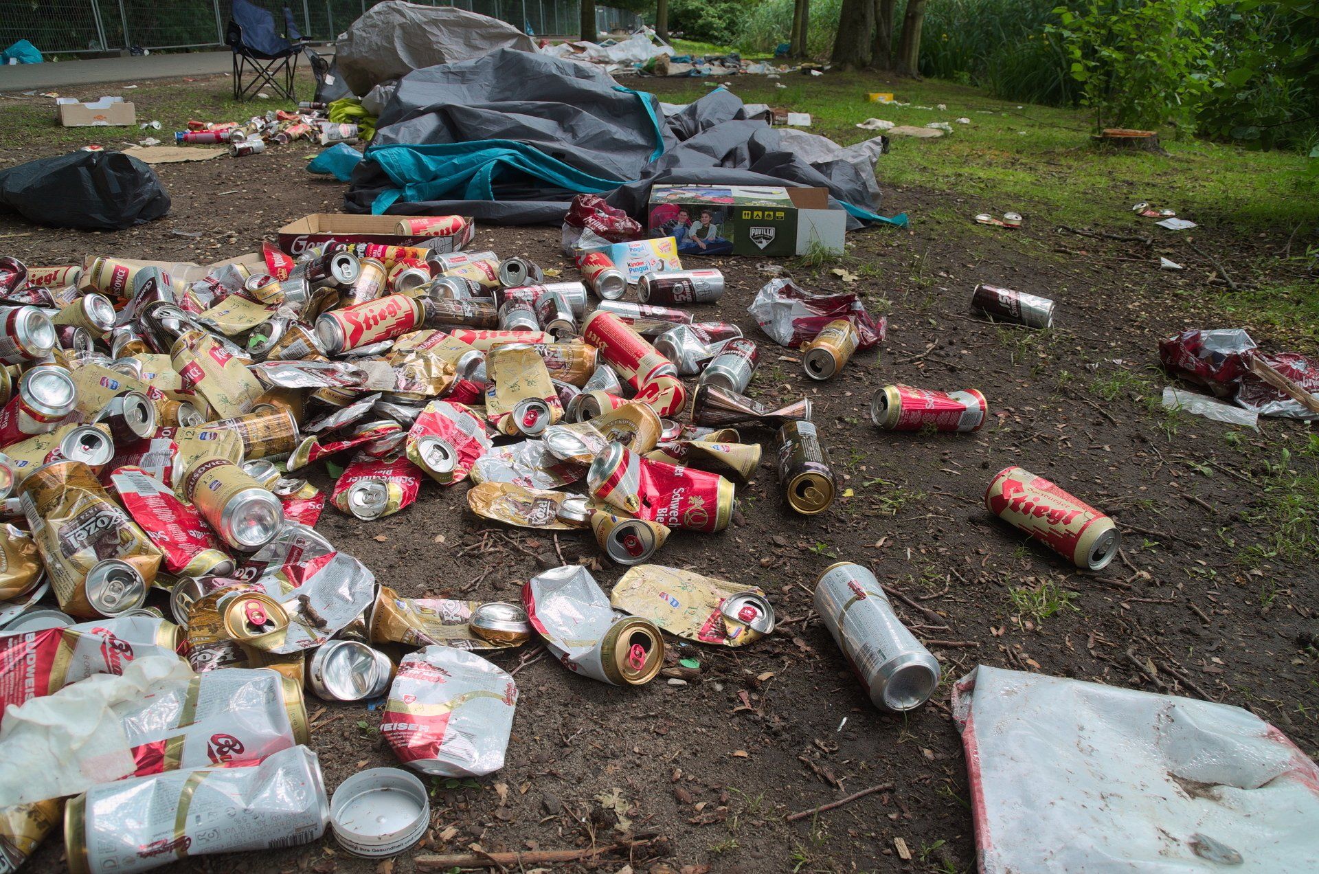 Schon am Parkplatz in der Nähe der Steintribüne fallen die noch rumstehenden Absperrgitter und erste kleine Müllhaufen auf.